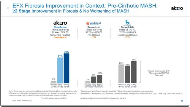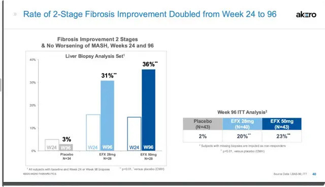 目前可以看到的对纤维化期数改善的总结如下:大于等于1期的逆转,50mg做到了75%,而安慰剂只有24%。其余的如图所示,正如AKRO所pre的,既有广度,也有深度,更有持续度。