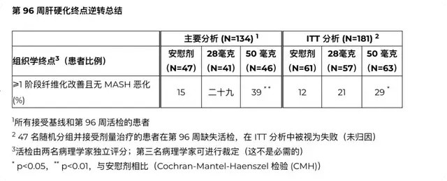 然后就是此次的96周完整的数据公布了。在基线和第96周进行活检的患者(n=134)中,接受50毫克EFX治疗的患者(n=46)中有39%的患者肝硬化逆转,且MASH没有恶化,而接受安慰剂治疗的患者(n=47)的比例为15%。在意向治疗(ITT)人群(n=181)中,50mgEFX组(n=63)中29%的患者肝硬化得到逆转,且MASH没有恶化,而安慰剂组(n=61)中这一比例约为12%。