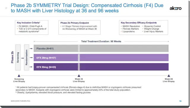 AKRO的公司公告中特意强调了一点:SYMMETRY研究显示,从第36周到第96周,50毫克组的效果增加了一倍多(从10%增加到24%),强调了更长时间EFX治疗对于代偿性肝硬化(F4)患者的益处。当然,笔者在参阅其2023年10月份公告的时候是没有看到10%这个数字的(可能是别的标准统计的百分比数字),此外,如图所示,其在PPT中还展现了肝纤维化改善上从24周到96周所翻倍的疗效。我想这可以视之为该临床试验超预期的原因之一:36周未到平台期,实现了巨大的突破。