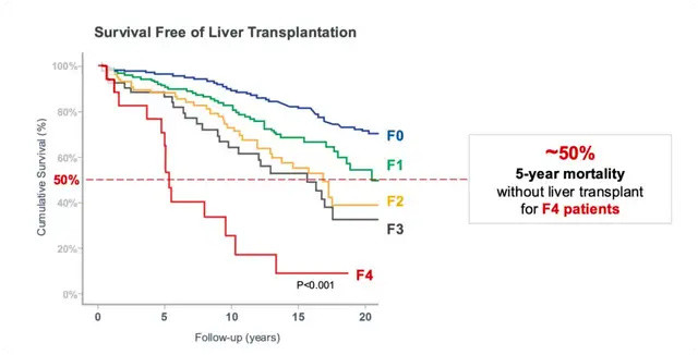 肝硬化分期可以分为F0-F4五个等级,分级的主要依据就是肝纤维化的程度导致的肝脏硬度测定值(LSM),其中F4级属于重度肝纤维化,分为代偿期(compasated)和失代偿期;若此时肝硬化患者已经进入失代偿期,那么其肝脏功能已经进入紊乱状态,生存率大概率在5年以下,如果还处于代偿期,那么生存率大概率还可以维持在5-10年。