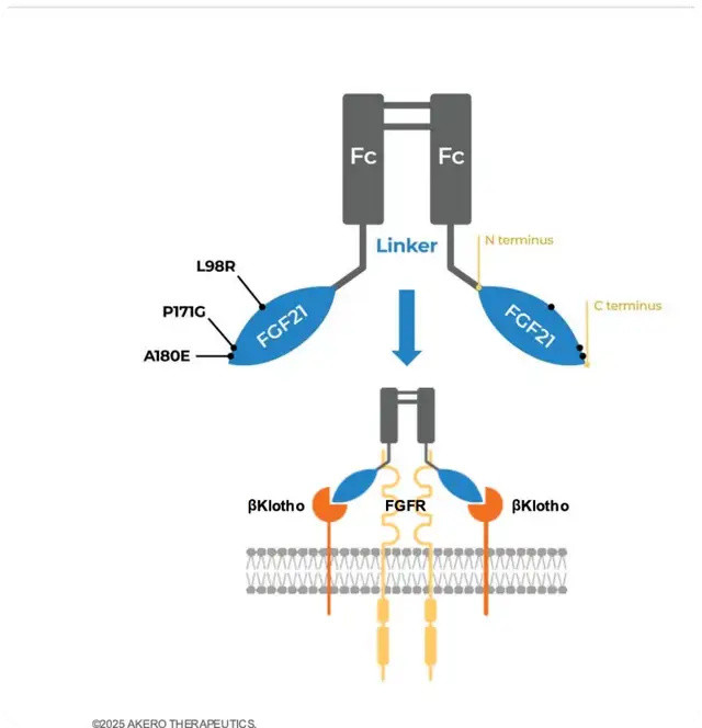 而efruxifermin(以下简称EFX)走的就是这个路线,它要做的,是FGF-21plus。它作为一个融合蛋白,其关键部分在于结构中的FGF-21类似物,并且在后面带了两条Fc链,为的就是相比于天然FGF-21提高其在人体内的半衰期,延长药效。通过将其做成融合蛋白大分子药物的方式,其能够做到一周一次给药。