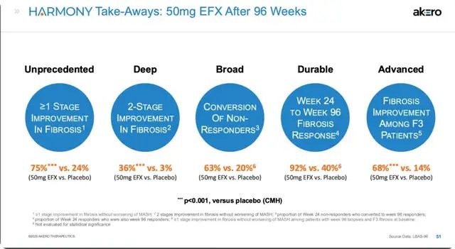 这里我们看AKRO在2023年10月发的36周期中数据情况:28毫克和50毫克EFX治疗组中分别为22%和24%的患者肝纤维化至少改善了一个阶段,并且MASH没有恶化,而安慰剂组这一比例为14%。此外,在每个EFX治疗组中,有4%的患者经历了三级或两级肝纤维化改善,并且MASH没有恶化-从代F4到F1或F2,而安慰剂组这一比例为0%。在第36周时,28毫克和50毫克EFX治疗组中分别有63%和60%的患者观察到具有统计学意义的MASH缓解率,而安慰剂组这一比例为26%,这是截至当时为止报告的此类患者群体中MASH缓解的最高反应率。